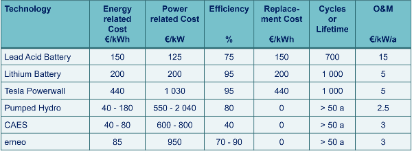 For a storage facility for 100 MW and 500 MWh capacity, the specific costs for cavern construction and surface facilities were determined. The following table shows these costs in relation to values of other storage methods.