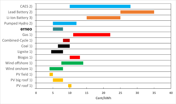 This is a standardized method for determining the electricity generation costs over the lifetime of a plant. In the case of storage, however, one should rather speak of LCOS - Levelized Cost of Storage. With costs of 5 - 8 EuroCent per kWh, a compressed air storage is in the same range as pumped storage or lignite-fired power plants. The storage costs were calculated for an efficiency of 70%.